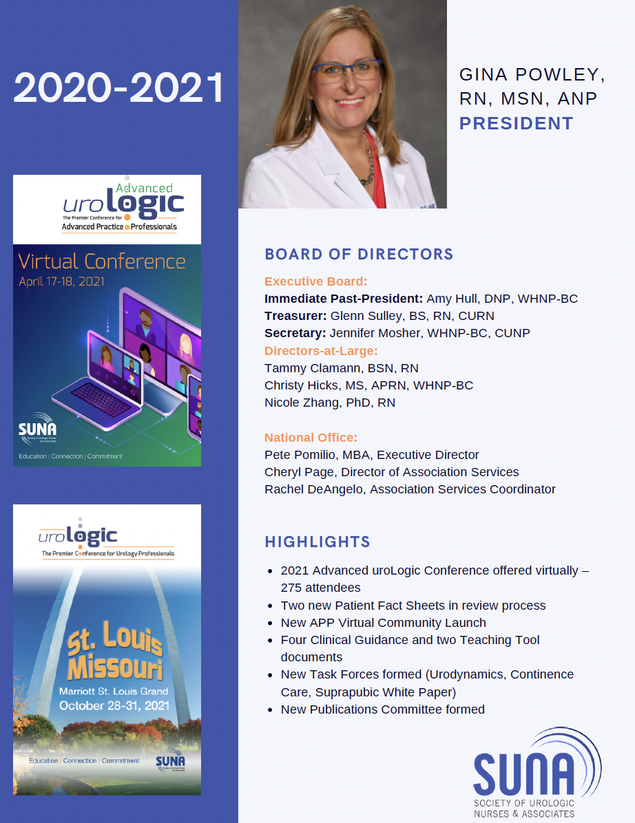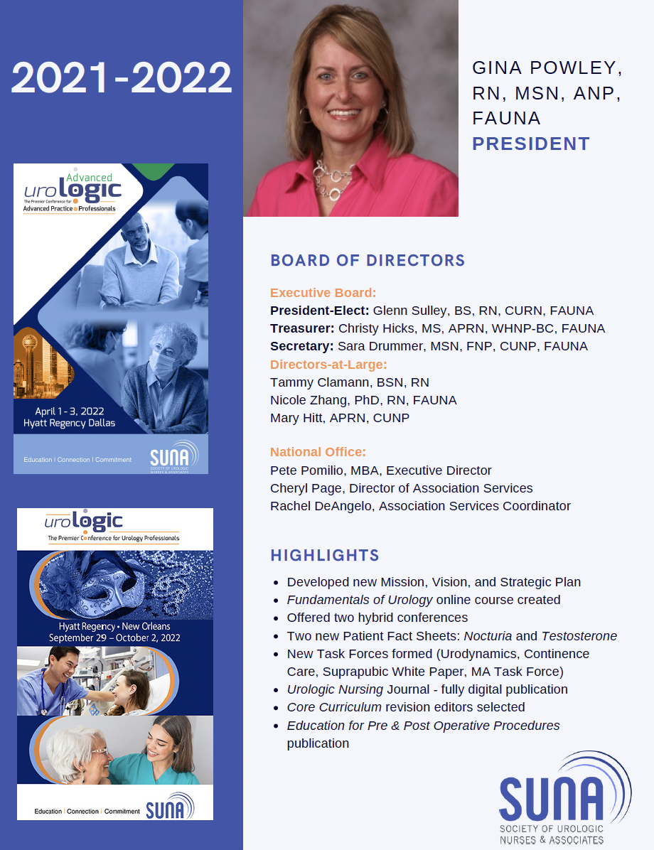 SUNA’s membership has always been all inclusive, meaning any health care professional trained and working in the field of urology is eligible for membership. This holistic team approach is unique to SUNA and one that has strengthened it throughout the years. SUNA is proud to be the recognized authority of urologic nursing care and education and sets the standard of urologic education for health care providers and patients.